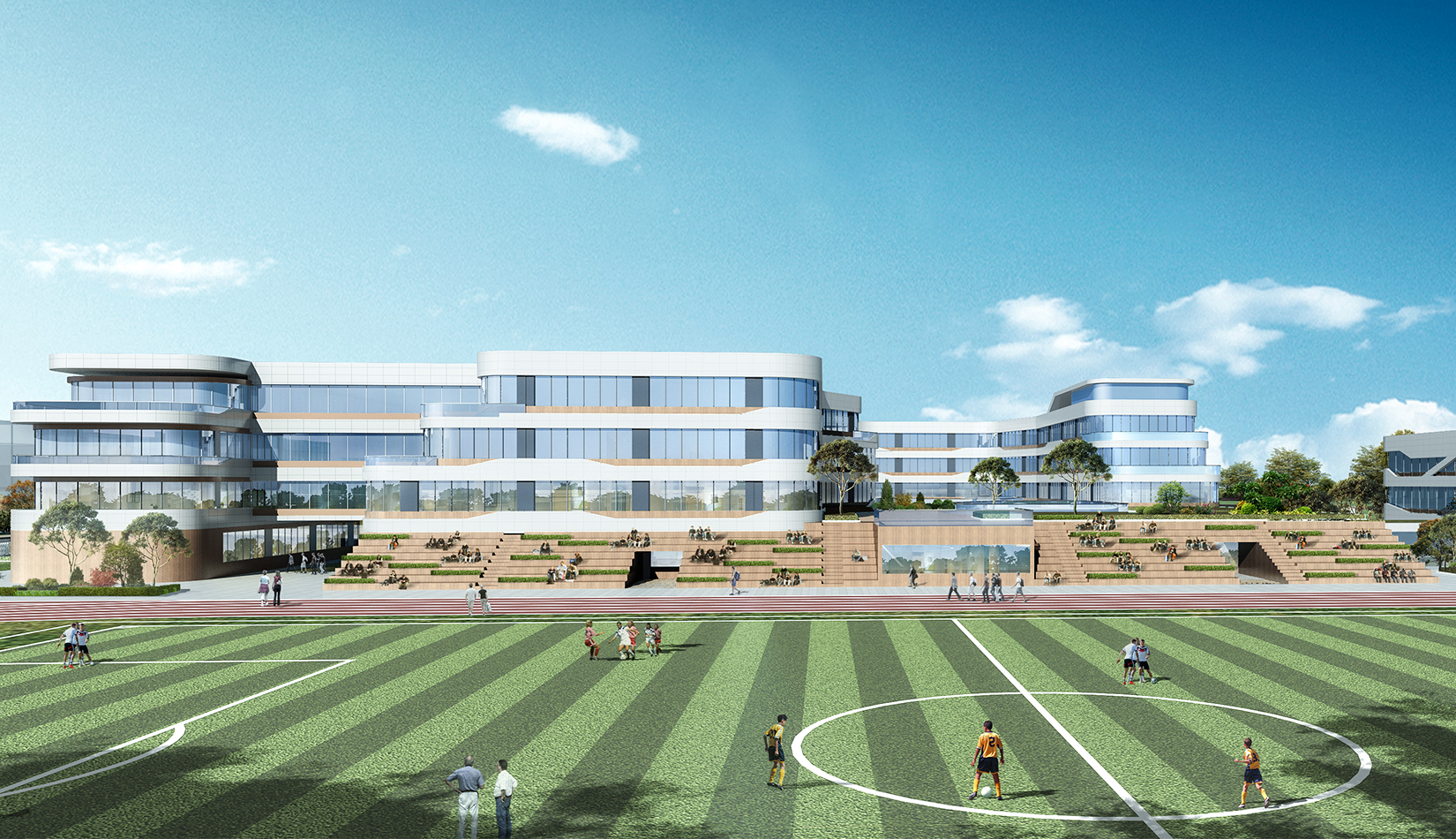 充滿綠化的連續(xù)平臺接通各教學樓,在東西南北方向形成內院,由西向東側延伸,與操場融為一體,提供了良好的視覺穿透性。建筑風格現(xiàn)代富有動感,線條流暢,形成強烈的可識別性。