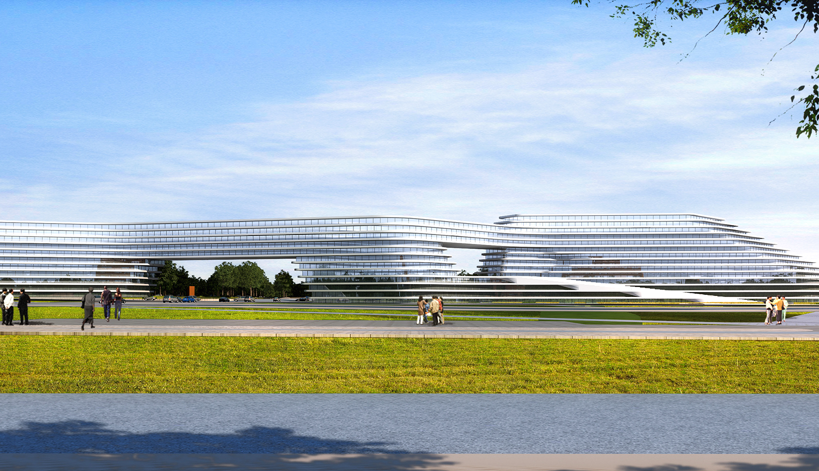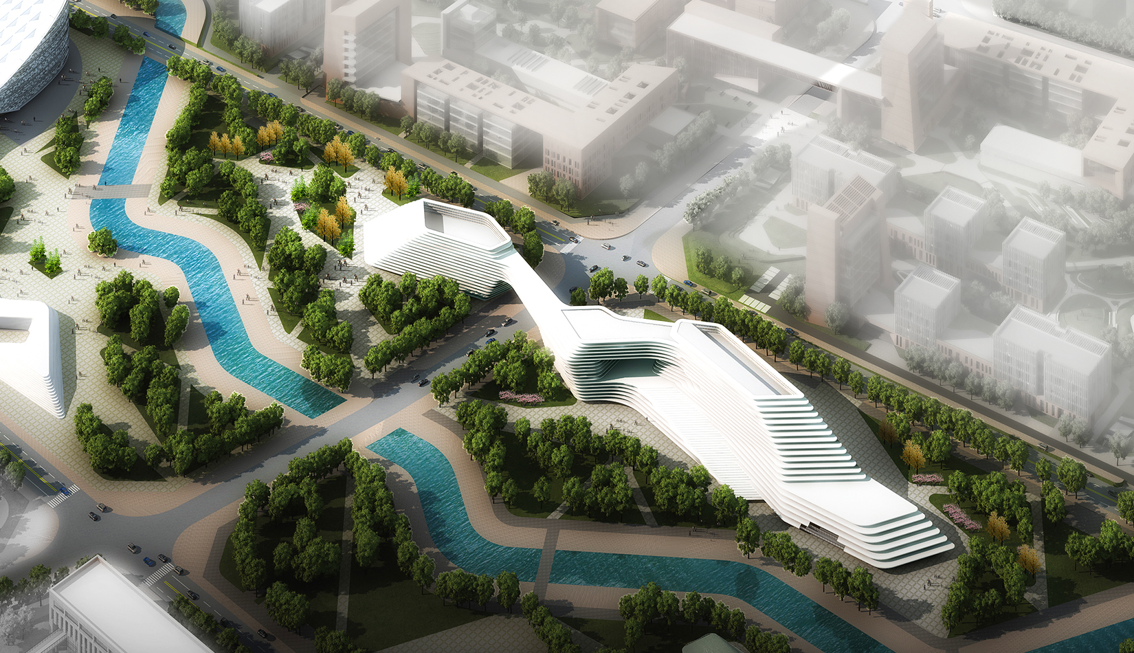 科學(xué)講堂位于中心區(qū)景觀主軸的中心腹地,其南的泄洪渠為景觀主軸的景觀帶。設(shè)計(jì)靈感源于中國(guó)天人合一的自然觀和社會(huì)觀,所謂仁者樂山智者樂水,通過對(duì)山、水肌理的分析與重構(gòu),轉(zhuǎn)換為建筑語(yǔ)言,形成獨(dú)具特色的建筑造型。建筑體量形成簡(jiǎn)單、沖突的場(chǎng)地氛圍,建筑南向正對(duì)園區(qū)中軸線,使得水平向延展的建筑生成了“東高西低”的無(wú)邊際界面。由“水面→河岸→場(chǎng)地→建筑”的溪水肌理驅(qū)動(dòng)建筑臨街面,逐步退后產(chǎn)生特有的河流沖刷意象。水流的蜿蜒曲折使建筑的轉(zhuǎn)彎處成洞,達(dá)到了內(nèi)外視線連續(xù)的綜合效果,并將對(duì)建筑的擠壓力平衡到建筑東西兩翼。建筑表皮通過對(duì)水的情緒變化等模擬,形成片狀的建筑造型。
