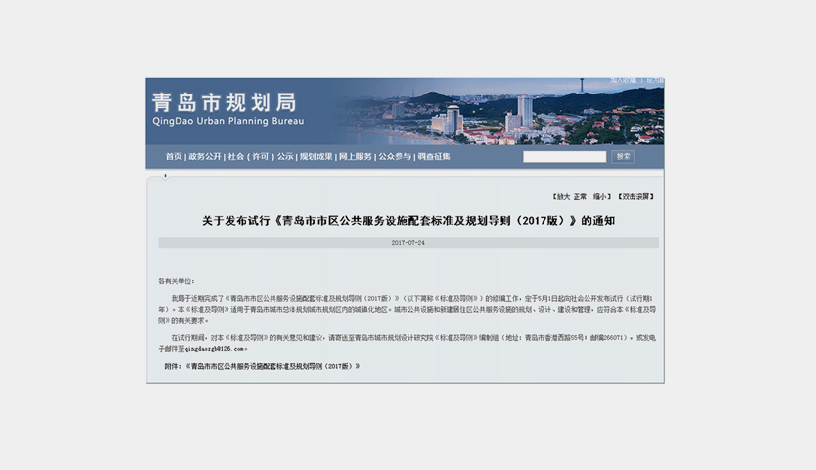 2017 年5 月1 日起向社會(huì)公開發(fā)布試行,成為青島市中心城區(qū)81片控制性詳細(xì)規(guī)劃、修建性詳細(xì)規(guī)劃公共服務(wù)設(shè)施規(guī)劃的依據(jù)。