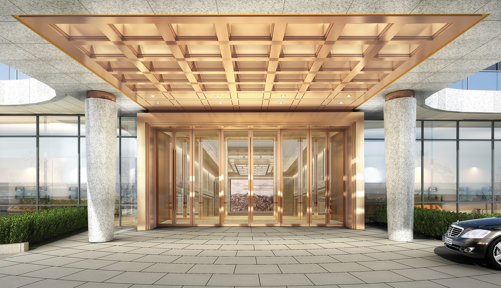 一層走廊---走廊為大廳一部分延續(xù)迎賓大廳的設(shè)計(jì)風(fēng)格,天花跌級(jí)有序,方圓向上,內(nèi)嵌如意紋理淺雕銅板, 增加厚重、文化與層次,墻面挺拔向上轉(zhuǎn)折有序,頭尾嵌入水紋樣式銅板雕刻,增加儀式感與莊重性,同時(shí)提升文化附加,簡練現(xiàn)代、精致細(xì)節(jié),突顯別致有序、莊重典雅。
