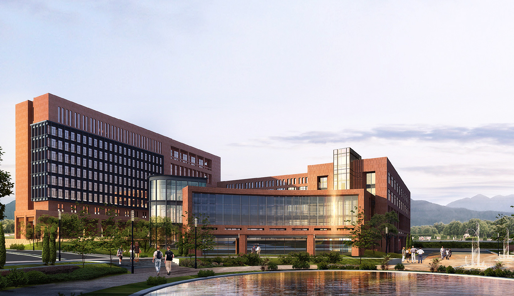 總體的規(guī)劃布局圍繞中心景觀廣場展開設計。首先從山區(qū)建筑布局師法自然,藏風聚氣的傳統(tǒng)觀念出發(fā),結合現(xiàn)代科學嚴謹求真務實的態(tài)度,設計以東側(cè)入口廣場導入的中心景觀空間圍合展開規(guī)劃布局,總體上根據(jù)土地的使用性質(zhì)分為四個區(qū),分別是正對主入口北側(cè)的生活區(qū),南側(cè)的孵化中心區(qū),正對主入口廣場的科研辦公區(qū),以及整個用地最南端的產(chǎn)業(yè)開發(fā)區(qū),各個區(qū)既相互獨立同時又緊密聯(lián)系,功能上即考慮主導風向又方便使用。