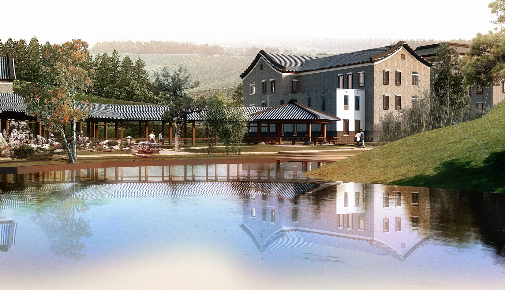 在構(gòu)思和總體布局上引入“潛龍情節(jié)”。結(jié)合用地南北狹長(zhǎng)、北面臨海的地形特征和自由靈活的建筑布局,將中華民族的文化象征——龍圖騰與傳統(tǒng)文化的燦爛之花——書畫藝術(shù)相結(jié)合,將主要軸線以龍為形,寓意著書畫藝術(shù)的振興和華夏文化的騰飛。