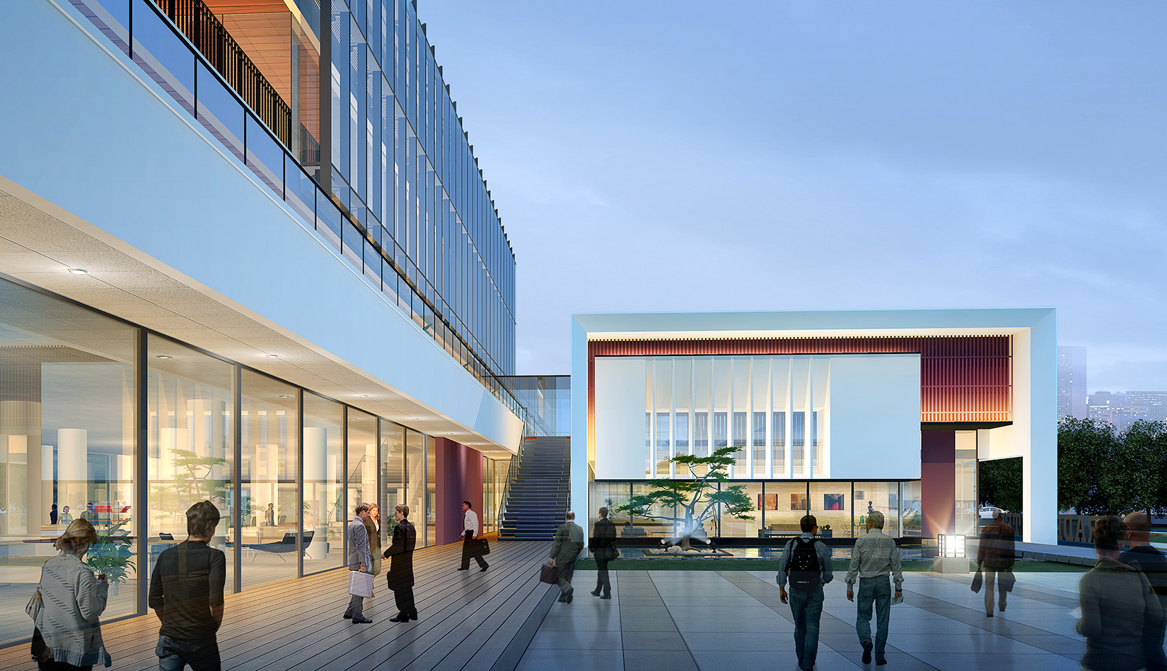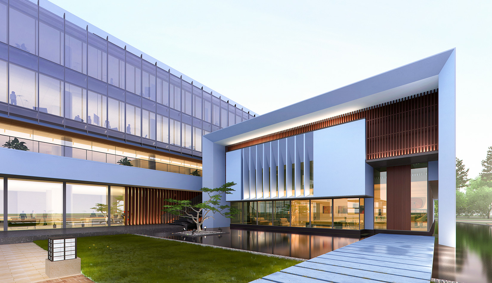 作為中韓貿易合作區(qū)一期啟動區(qū)的重點項目,其承擔著對外展示以及為后續(xù)發(fā)展提供服務平臺的功能。因此設計力求穩(wěn)重大氣,以4 層的體量打造出地標性的建筑。設計運用簡潔的外形、寧靜的色彩,外立面以白色涂料和木格柵為主,尊重自然,打造一種平和寧靜的感覺。在空間設計上通過共享空間、上人露臺和一層大平臺,創(chuàng)造出舒適宜人的工作環(huán)境;在技術上通過地源熱泵、呼吸式幕墻、雨水收集等的應用,實現(xiàn)建筑的綠色節(jié)能環(huán)保。